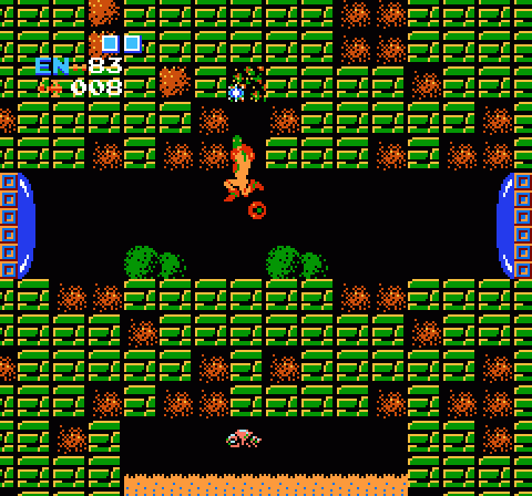 If you simply roll into a ball, well, you’re screwed. The bombs won’t open a door, and you can’t stand back up. But if you immediately stand after ducking, something about the animation makes it possible to rise again — and not only will Samus stand, she’ll actually be situated one block of the wall higher than before ducking. Repeat this rapidly and Samus will slowly climb the inside of the wall and off the screen. However, if you tap jump rapidly, her attempts to leap will cause the screen to slowly readjust to place her at the center. With an alternating combination of ducking/standing actions and rapid jumps, Samus can climb any vertical chamber.