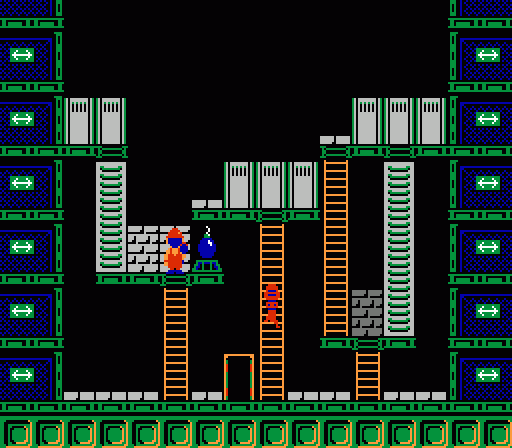 Wrecking Crew launched in Japan just a few months before Super Mario, and it really throws the latter game’s achievements into high relief. This isn’t to say Wrecking Crew is bad, but it feels very iterative, a small twist on the well-trod classic arcade concept. What makes it interesting is that despite the hazards and the score count, it’s not really meant to be a challenge in the traditional sense. It features nearly 100 different stages, but you can select any stage you like right from the menu screen at the outset. Wrecking Crew has more of a tourist approach to game content, with no particular end in mind, just a whole lot of puzzles to be solved and a random assortment of secrets that can boost your score if you can sort out their rules (and if you care about such things).