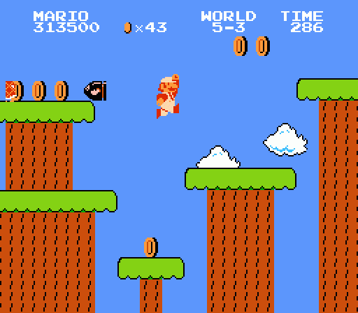 5-3 and 5-4 are the 2.0 versions of 1-3 and 2-4. I take it that Nintendo knew Famicom cart limitations of the time wouldn’t be enough for 32 wholly original levels (They repainted clouds into bushes after all), so we get some old stages rebranded with some new hazards.