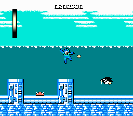 And hey, that’s not all. Past the initial wave of foes, the icy ground gives way to water. Mega Man doesn’t use the same fluid physics as its sequels, so you can’t jump higher than normal here. The action does slow down somewhat, but I’ve never been able to tell if that’s because water is meant to create extra resistance of if something in this portion of the level causes slowdown.