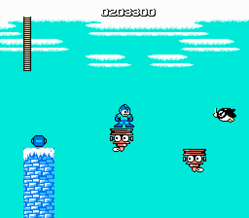 Even if you manage to avoid these projectiles, the platforms themselves pose a terrible hazard. Thanks to their flaky hit detection, their neutral upper decks sometimes will unintentionally just sort of stop registering as ground, causing you to fall through to hit the dangerous robot below. Or else you’ll inexplicably take a hit and go sliding off from hitstun. They’re especially dangerous when they rise, since Mega Man doesn’t treat them as ground, and sometimes you’ll clip through the top as it climbs and die.
