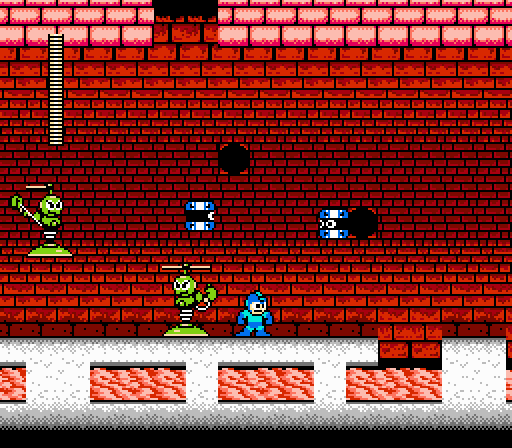 Likewise, the blue barrel-shaped robots emerge from small hatches in the wall and drift slowly in a homing pattern toward Mega Man’s position, constantly changing direction to track his movement. Up to three can appear on-screen at once, and while they may not seem like much of a threat here, they serve a similar role to the mini-goblines in Air Man’s stage: They’re slow, persistent, omnipresent threats that interfere with your carefully timed movements as you’re navigating more active environmental hazards.