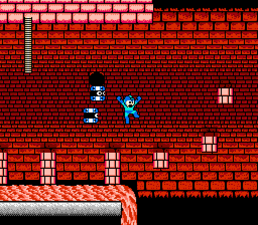 While not the most visually diverse stage in the game, Heat Man’s level does a great job of using the NES’s minimal color capabilities to create the impression of a tunnel through which a channel of lava flows. The floor beneath which the lava runs throws a shadow up against the walls, which appear to curve into the background. It’s a simple effect, but it makes for a great example of smart graphic design on the system. Four colors can go a long way!