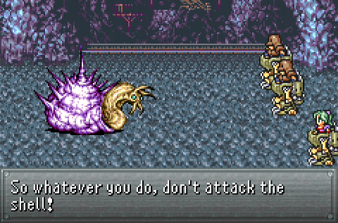 However, like the Mist Dragon in Final Fantasy IV, Ymir has a tendency to switch to a combat form that leaves you with only the “bad” target. When it withdraws its head, you can’t attack without taking far more relative damage than you deal. You’re given a brief warning that it’s about to transform (the snail grumbles some wordless dialogue first), and once that happens all you can really do is wait. Or, if you get sloppy and attack after the shell has retreated, you can use this lull to heal up.