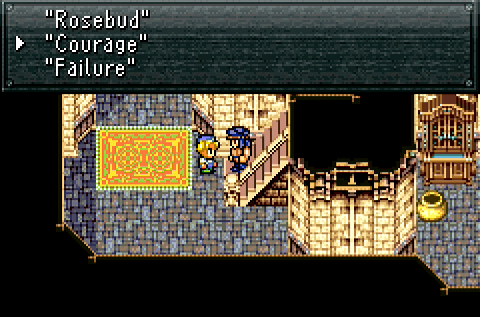 Once you have the cider, you give it to the old man, who… does nothing for you. Weirdly, the game drops you into a guessing game, since the old drunk forgot the password to get through town. Still, this does open up a dialogue prompt with the kid obstructing the stairway that leads to the back part of town and the mansion’s service entrance, which is the real point. But you have to take a wild guess at the password to get through. Though there’s no penalty for failure, so again, this is one of those instances where FFVI puts up a semblance of complexity without really delivering.